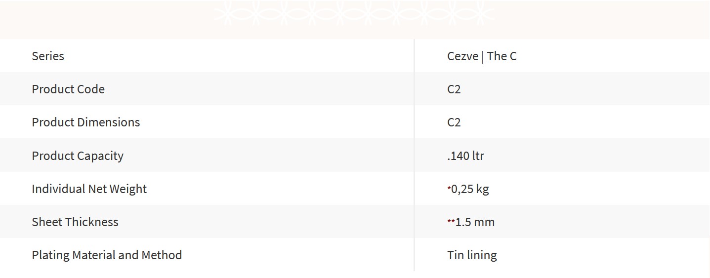 La C2G è la cezve / ibrik più piccola della nostra gamma ed è l’ideale per la preparazione di una tazza di caffè turco